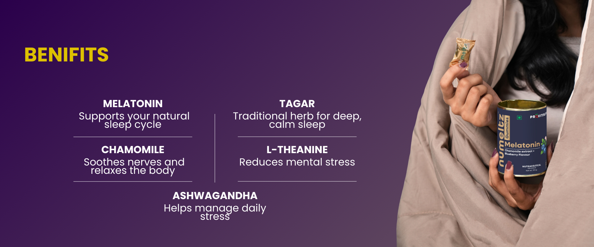 Your nights shouldn’t be restless — even when your schedule is. Stress, screen time, night shifts, travel, and jet lag can confuse your body clock and disturb your sleep.Numeltz Melatonin Gummies gently reset your internal rhythm. Melatonin, your body’s natural sleep hormone, signals your brain when it’s time to rest. We’ve combined it with a Herbal Calm Blend of Tagar, Chamomile, and Ashwagandha, plus L-Theanine to quiet racing thoughts and relax your senses.